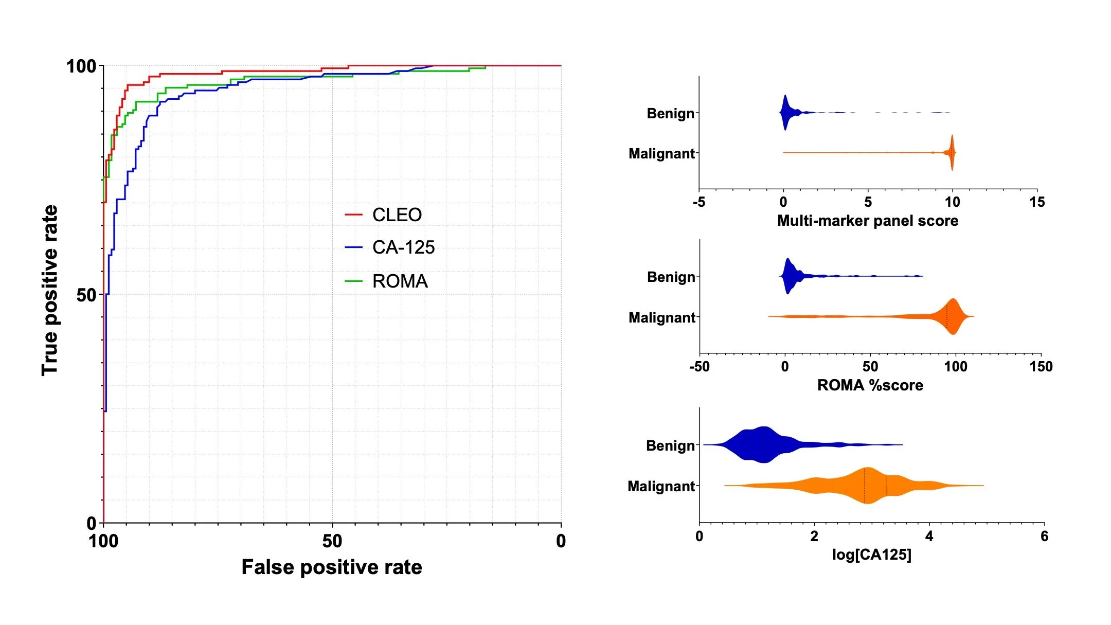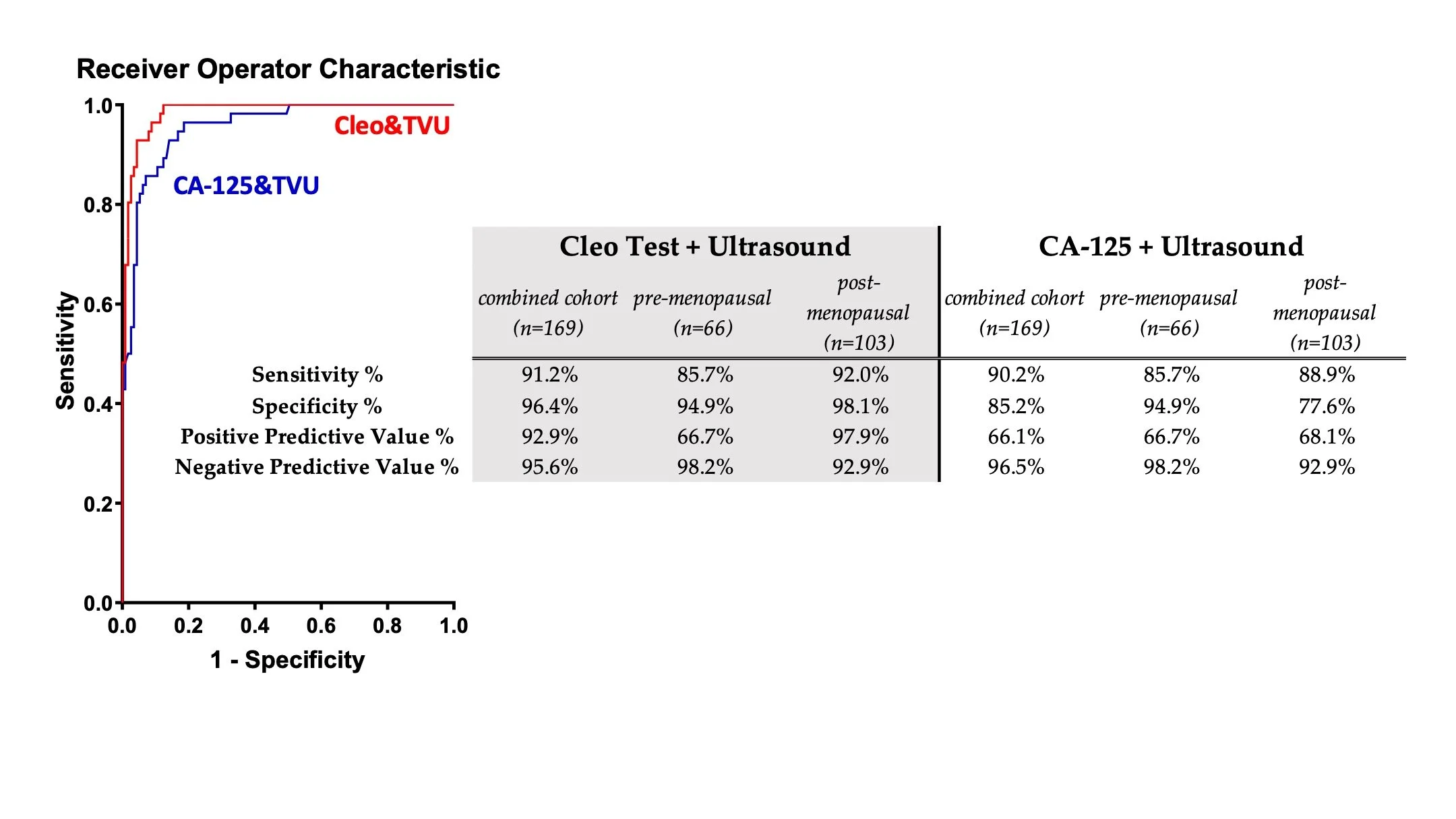 Combination of the CleoDX test with transvaginal ultrasound imaging provides greatly enhanced ability to discern between benign and malignant disease. In particular the positive predictive value – that is the ability to correctly identify malignancy in the overall cohort – increases to 92.9% when CleoDX triage test is used with ultrasound findings, compared to 66.1% using the standard CA-125.
