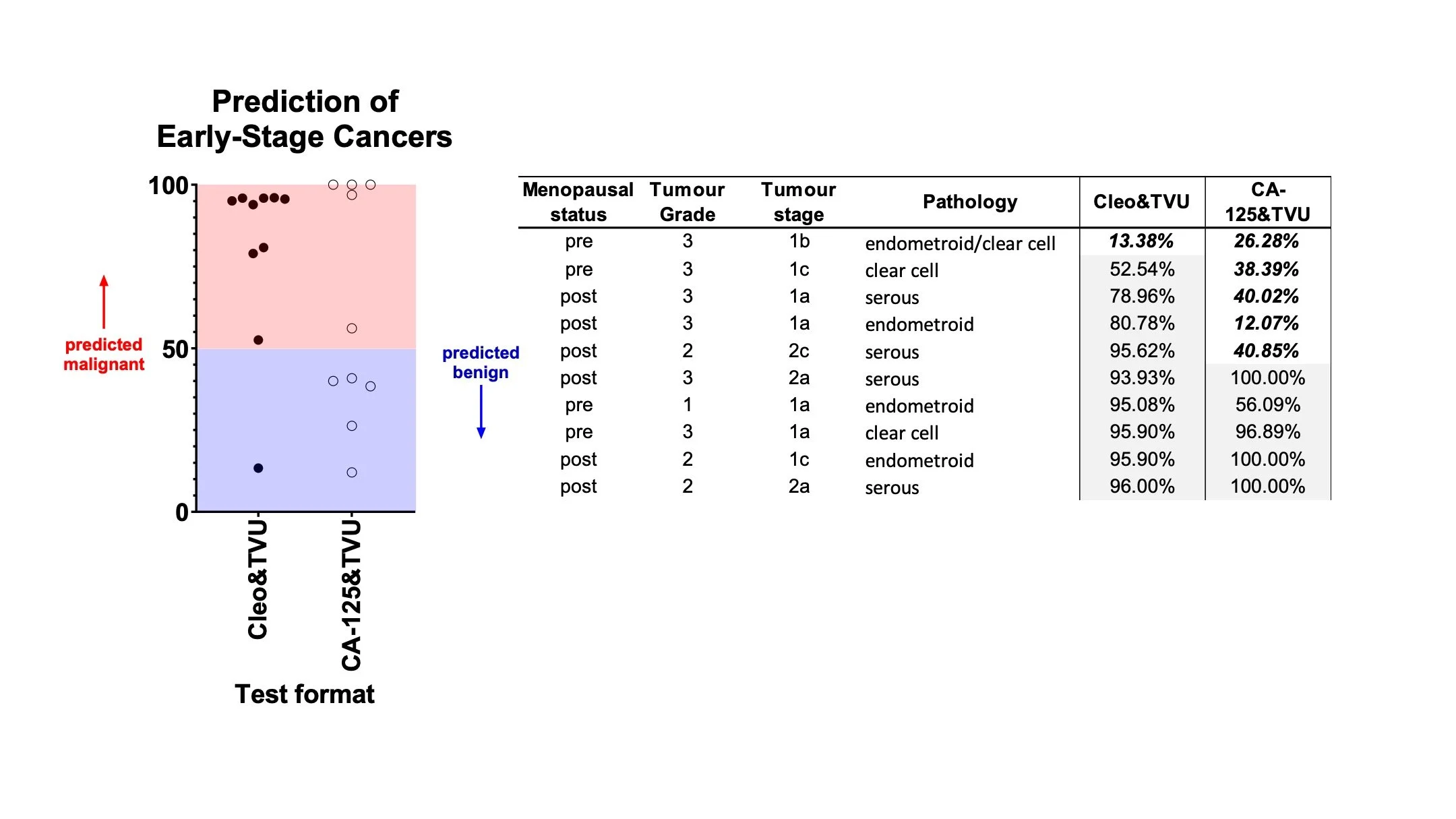 This provides a highly specific and sensitive predictor for the presence of malignant ovarian tumours at all stages, as well as an excellent negative predictor to exclude benign disease.